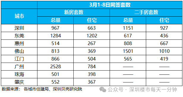 据深圳贝壳研究院统计,3月1-8日大湾区八个城市新房住宅累计网签突破4500套,其中深圳超500套;二手房方面,深圳、东莞、惠州、佛山、江门五个城市共网签超4500套,其中佛山超900套,领先于其他城市。