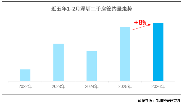 根据贝壳研究院监测数据,2026年1-2月,贝壳深圳合作门店二手房签约量较去年同期增长8%,创下近五年深圳二手房市场开局最高水平。这一“开门红”为全年的市场走向奠定了一个积极的基调。从带看量到实际成交的转化效率明显提高,反映出买方入市的意愿和决策速度均在增强。