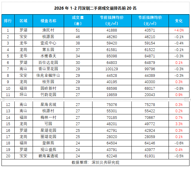 根据深圳贝壳研究院盘点,罗湖的渔民村、宝安的桃源居、龙华的壹成中心位列二手房成交量排名前三;从价格上来看,罗湖的渔民村、龙岗的可园、坪山的竹韵花园等项目,挂牌价珺上涨,表现出业主信心逐步恢复。