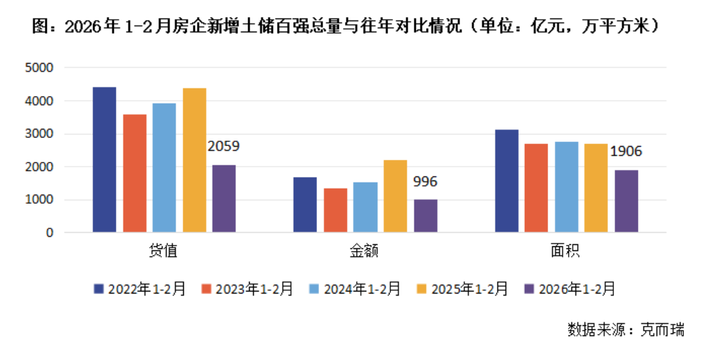 2026年前两月,受地方供地尚未开启及春节假期因素影响,多数规模房企并未开启投资铺排,因此典型企业拿地货值、金额、面积均出现同比下降。其中,新增土储百强房企的新增货值、总价和建面百强之和分别为2059亿元、996亿元和1906万平方米,货值、金额降幅近五成,面积较同期下降29%。