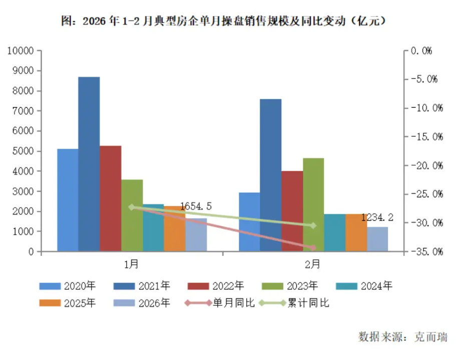报告显示,2月典型房企实现单月销售操盘金额1234.2亿元,前2个月累计实现销售操盘金额2888.7亿元。