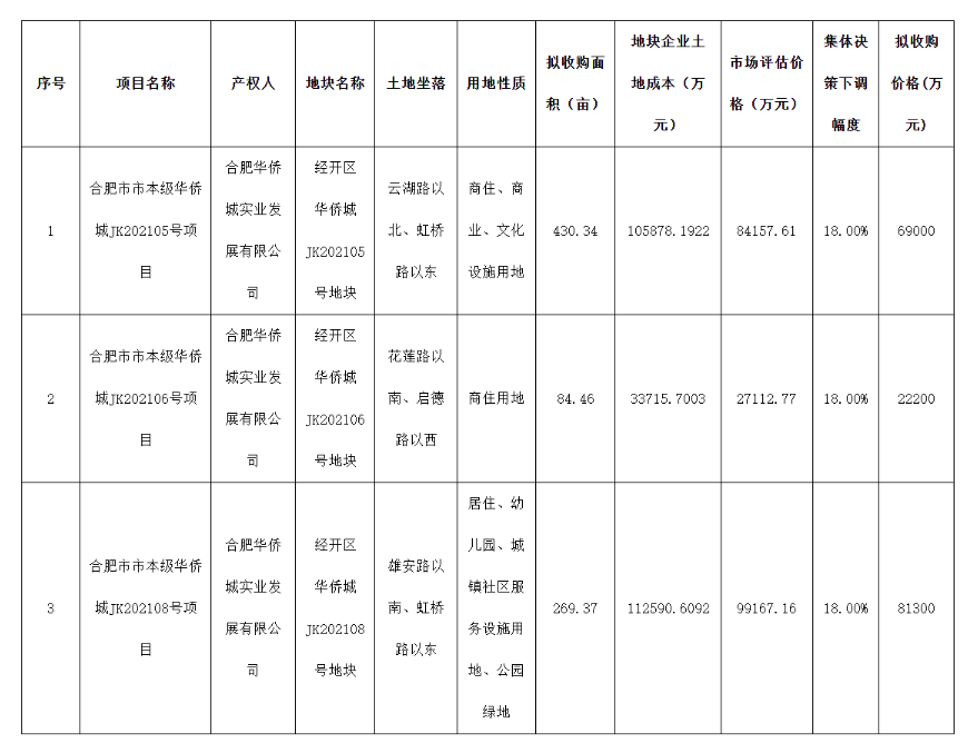 3月11日,澎湃新闻在合肥市自然资源和规划局网站发现,近日,该局发布了《关于合肥市市本级2026年收回收购存量闲置土地项目申报地方政府专项债券拟收回收购价格的公示》,其中提到,合肥市拟收回收购三宗位于市本级的闲置土地,涉及华侨城集团有限公司旗下合肥华侨城实业发展有限公司的JK202105号、JK202106号及JK202108号项目,拟收购价格合计为17.25亿元。