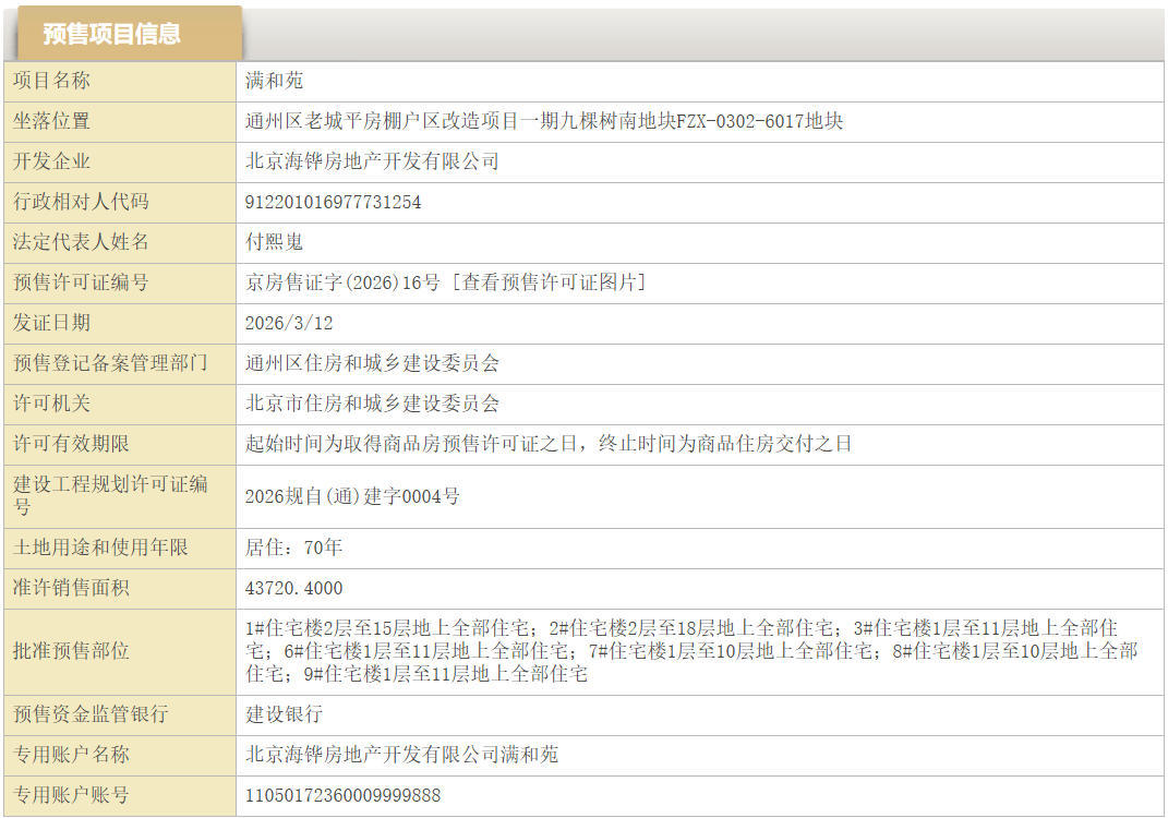凤凰网房产北京讯 3月12日,凤凰网房产从北京市住建委官网获悉,位于通州九棵树板块的中海·玖樹满和获取预售证,备案名为满和苑。据悉,该项目是是中海在北京落地的首个「和」系产品。