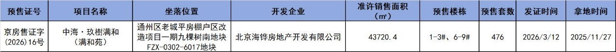 3月9日至3月15日,北京仅1盘获取预售证,该项目为通州九棵树板块的中海·玖樹满和。信息显示,批准预售部位涉及7栋住宅楼(1-3#、6-9#),准许销售面积43720.40平方米,共计476套房源,批准销售均价在5.4万/㎡-5.9万/㎡之间。
