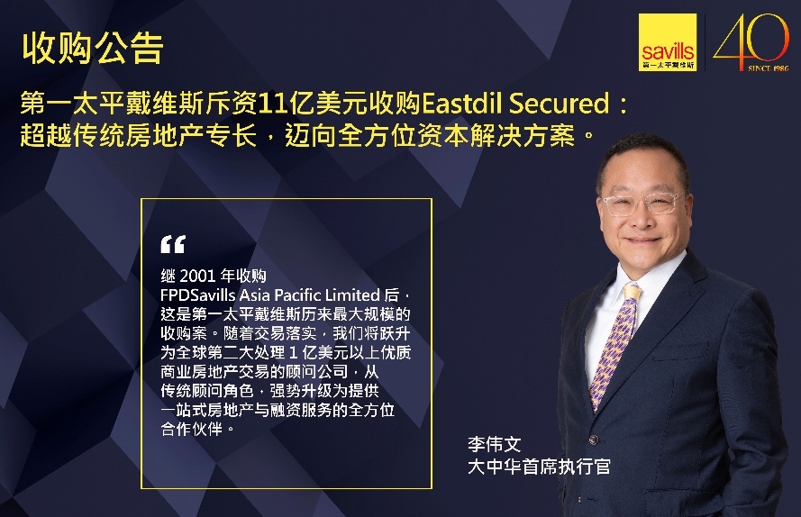 第一太平戴维斯大中华首席执行官李伟文先生表示:“我们非常高兴欢迎 Eastdil Secured 及其优秀的全球团队加入第一太平戴维斯。继 2001 年收购 FPDSavills Asia Pacific Limited 之后,此次交易是 Savills 历史上规模最大的一宗收购。交易完成后,我们将成为全球第二大处理 1 亿美元以上优质商业房地产交易的顾问公司,并从传统顾问角色进一步蜕变为提供一站式房地产与融资服务的全方位整合合作伙伴。这项收购彰显了我们致力打造真正整合的房地产及资本顾问平台的决心。透过扩展资本市场及财务顾问服务能力,我们正由传统房地产顾问进一步蜕变为提供一站式房地产与融资服务的全方位合作伙伴,为客户带来更全面、更灵活及更多元化的解决方案 。”