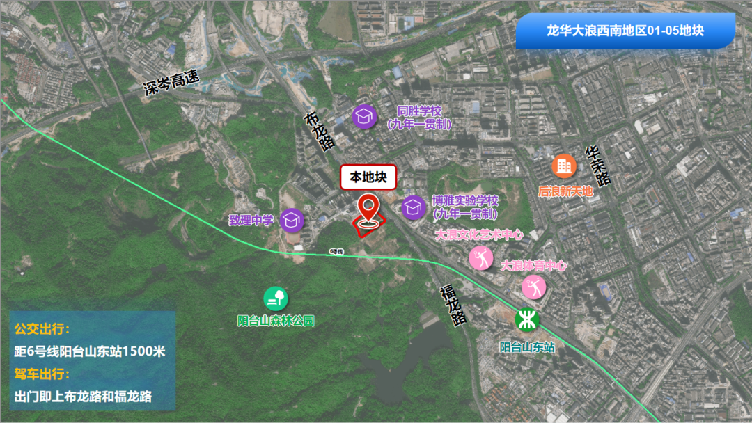 地块位于龙华大浪片区,土地面积约2.33公顷,于2023年调整规划为居住用地。地块交通便利,背靠阳台山森林公园,生态资源丰富。周边有博雅实验学校、大浪体育中心等公共设施。邻近的阳台山东站正是大型城市更新项目云麓花园(原鸿荣源赖屋山项目),区域整体开发氛围浓厚。