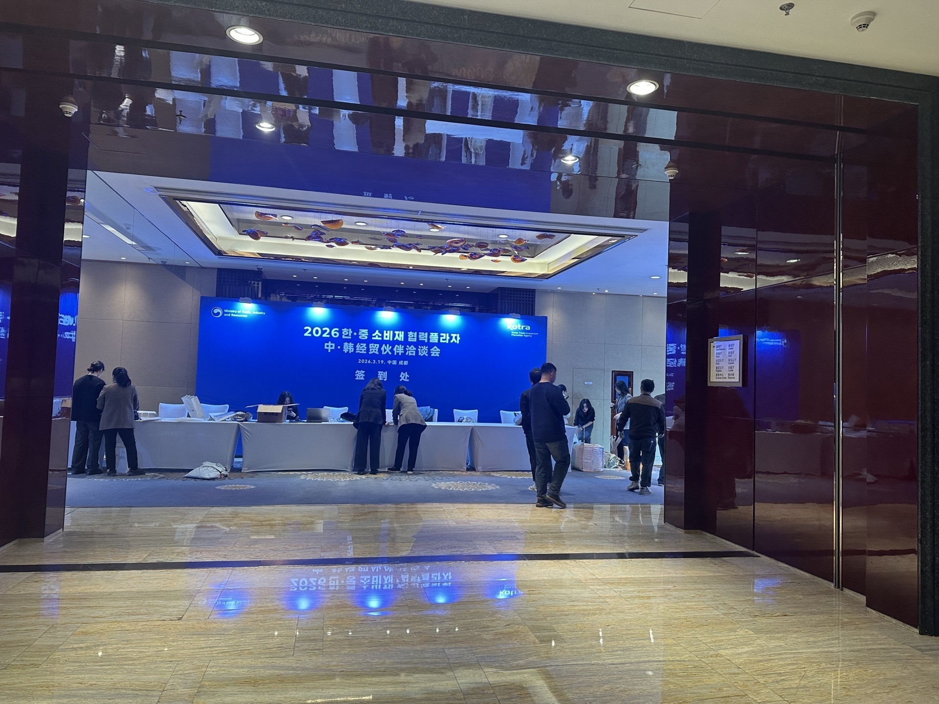在酒店二楼宴会厅,记者看到一场关于“中·韩经贸伙伴洽谈会”的活动即将举行,厅内一片繁忙景象,多名工作人员正在进行前期的布展准备工作。