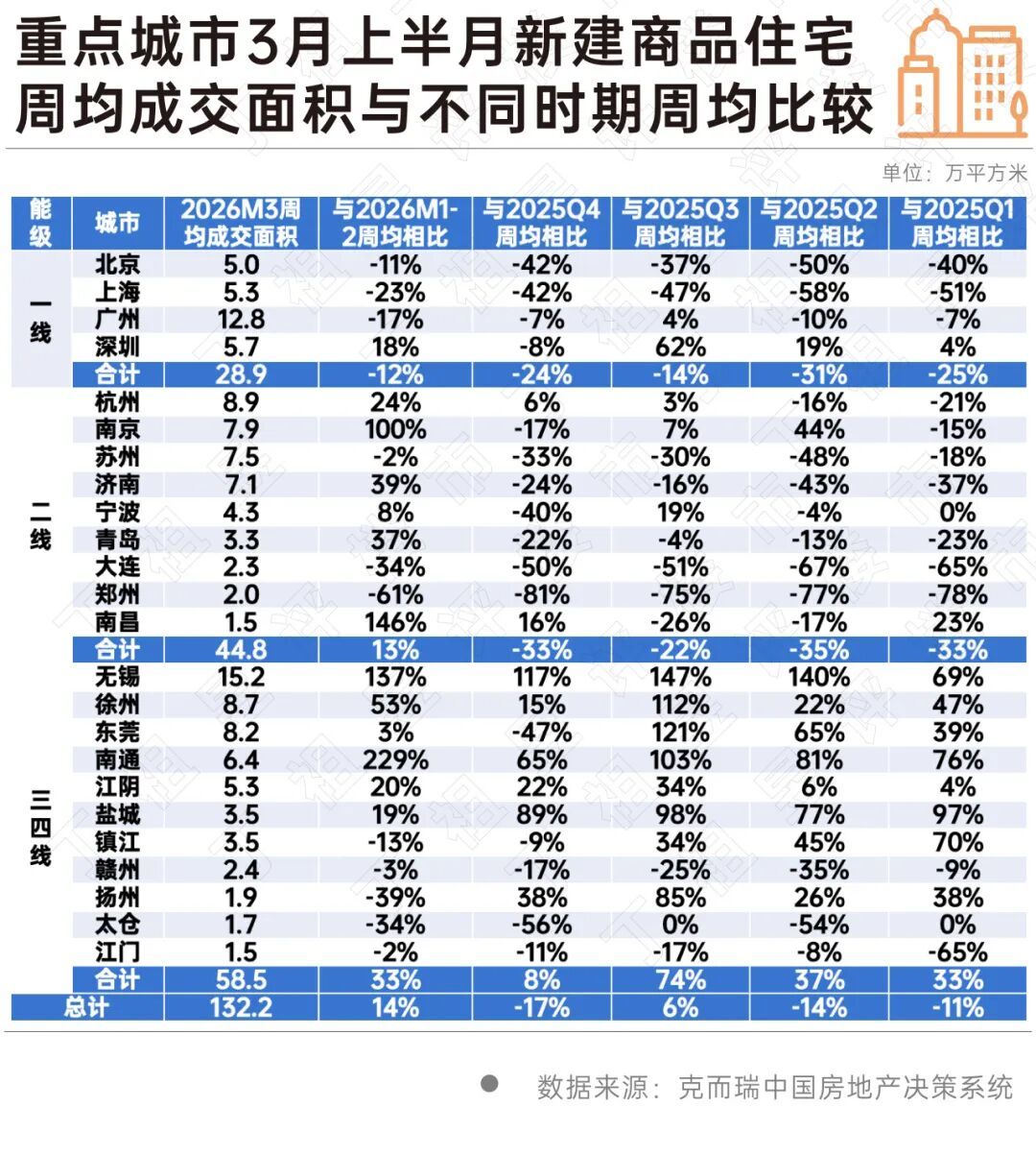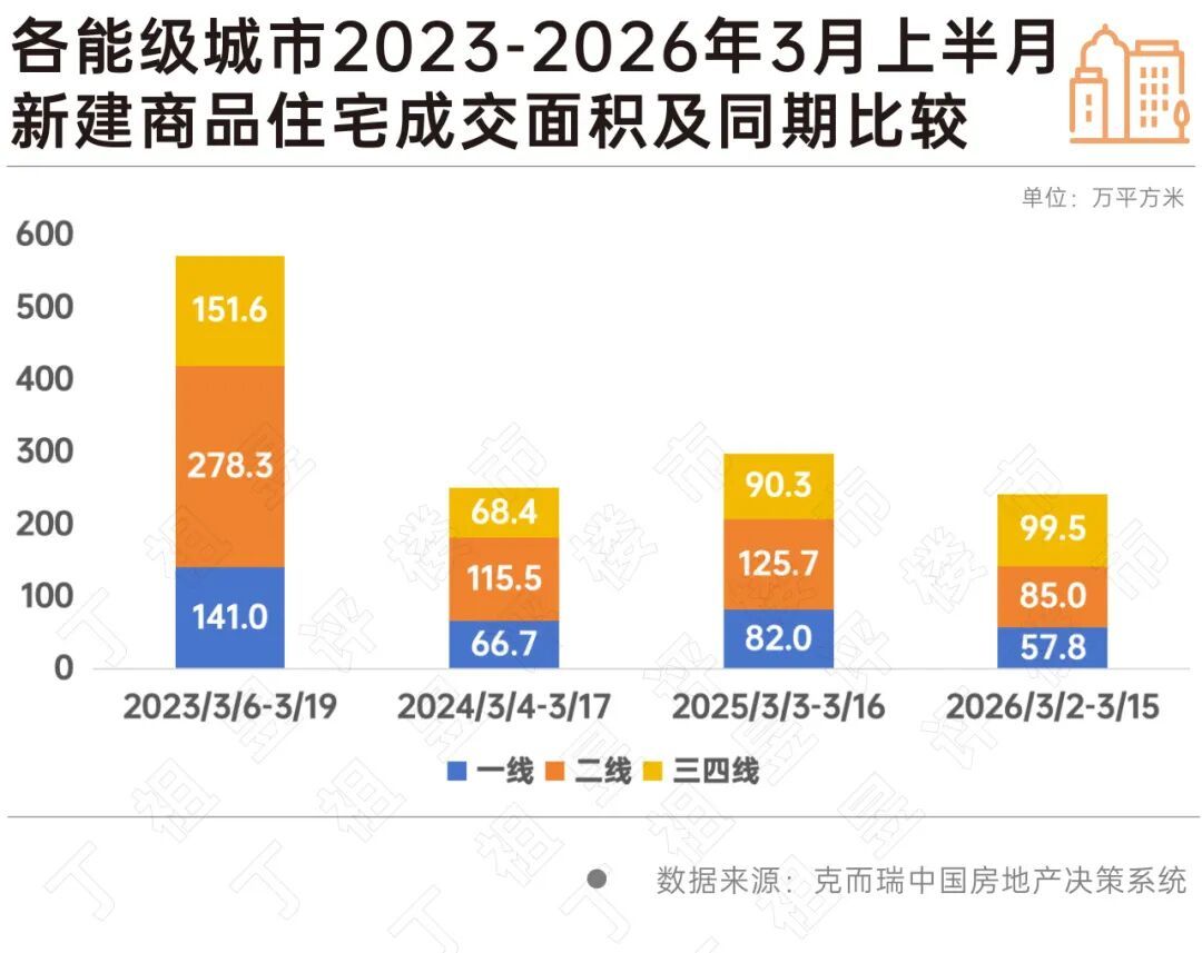 克而瑞数据显示,2026年3月上半月(3月2日至3月15日),重点24城市新房成交面积247万平方米,同比下降20%,与2024年水平相当,略低5%。