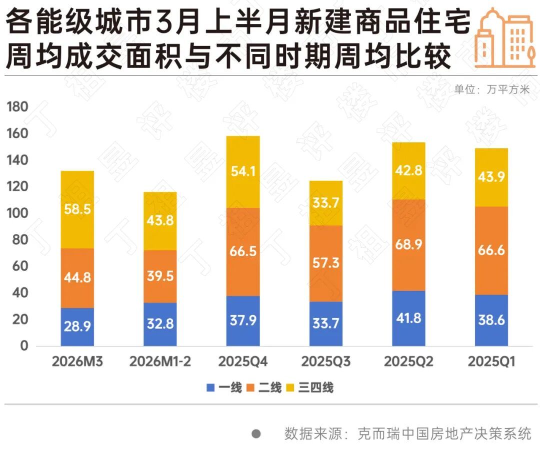 值得注意的是,上半月三四线城市整体保持增势,2026年3月前2周成交面积99.5万平方米,同比增长10%,且相较2024年增长45%,已连续两年保持增长。