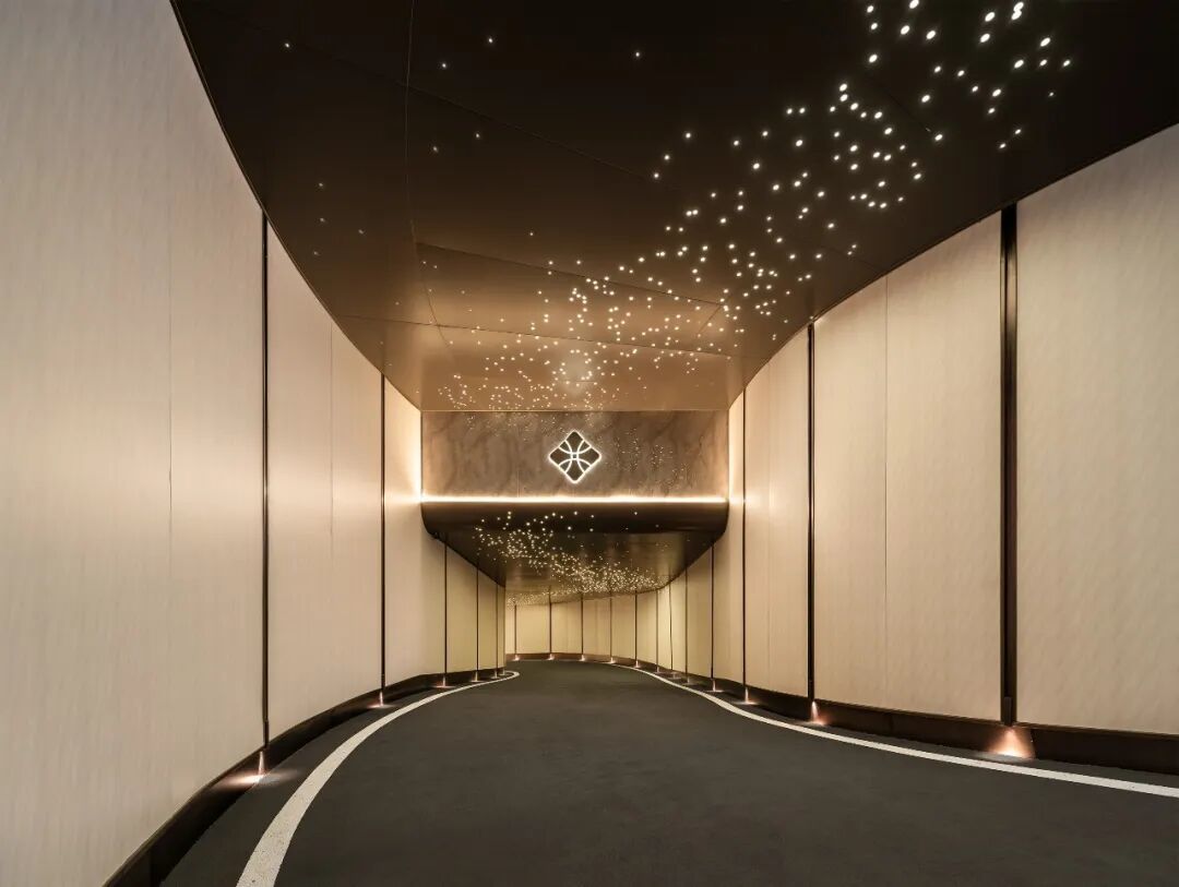 当驶入地库入口,金属星空造型顶棚徐徐展开,浅色格栅吊顶与流动的线性灯带交织,流光溢彩。