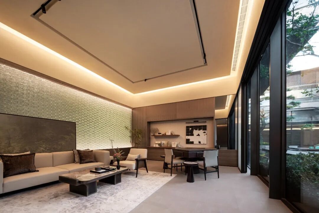 中建·合玺东方从千年前的西园雅集中汲取灵感,功能上一应俱全。雅集会所一层设有接待前厅、观赏亭,负一层设有行政酒廊、茶室、棋牌室、健身房、私宴厅、恒温泳池……约12.5米宽的全景玻璃,景观视线的交融和渗透,重塑空间想象。