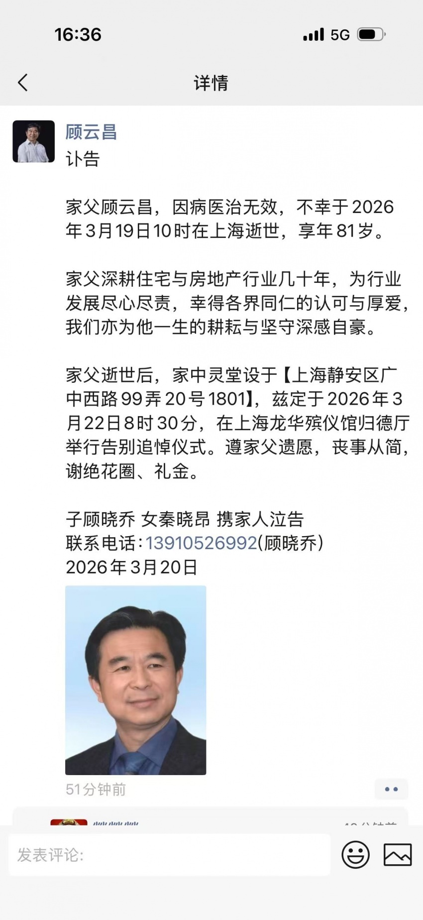 3月19日,著名房地产专家顾云昌先生因病医治无效,在上海逝世,享年81岁。