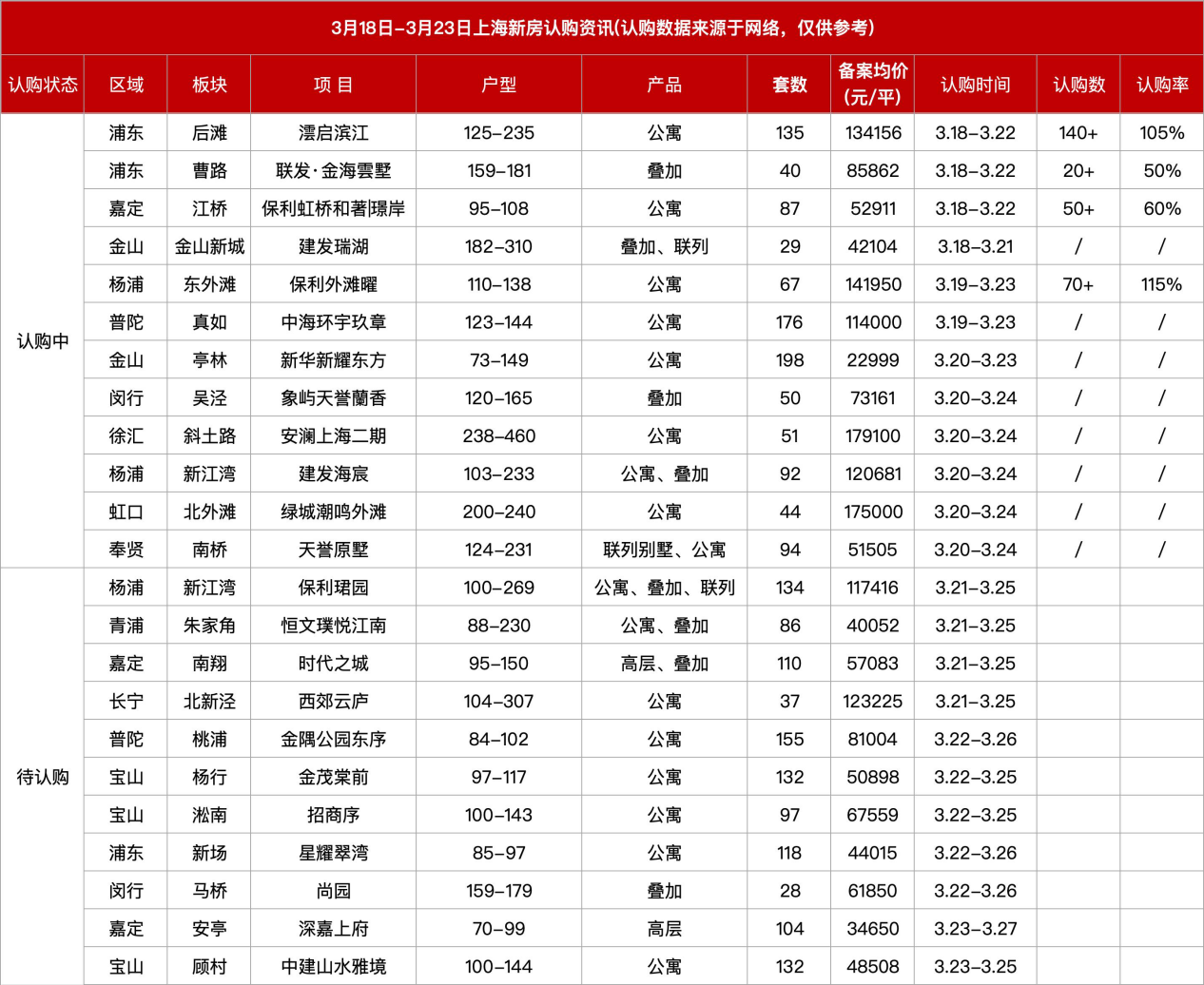 据不完全统计,3月18日至3月23日期间,上海共有20余个项目处于认购阶段,覆盖浦东、杨浦、普陀、嘉定、宝山等多个区域。