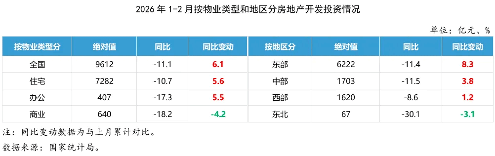 具体来看,房地产开发投资增速方面,跌幅出现收窄态势。1-2月份,全国房地产开发投资9612亿元,同比下降11.1%,降幅比上年全年收窄6.1个百分点;其中住宅投资7282亿元,下降10.7%,降幅收窄5.6个百分点。