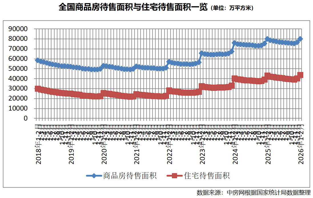 商品房库存方面,同比增速接近归零,为2022年以来最小同比增幅。截至2月末,商品房待售面积79998万平方米,比上年末增加3366万平方米,同比增长0.1%,增速比2025年末回落1.5个百分点。其中,住宅待售面积43752万平方米,比上年末增加3516万平方米,同比增长1.3%。