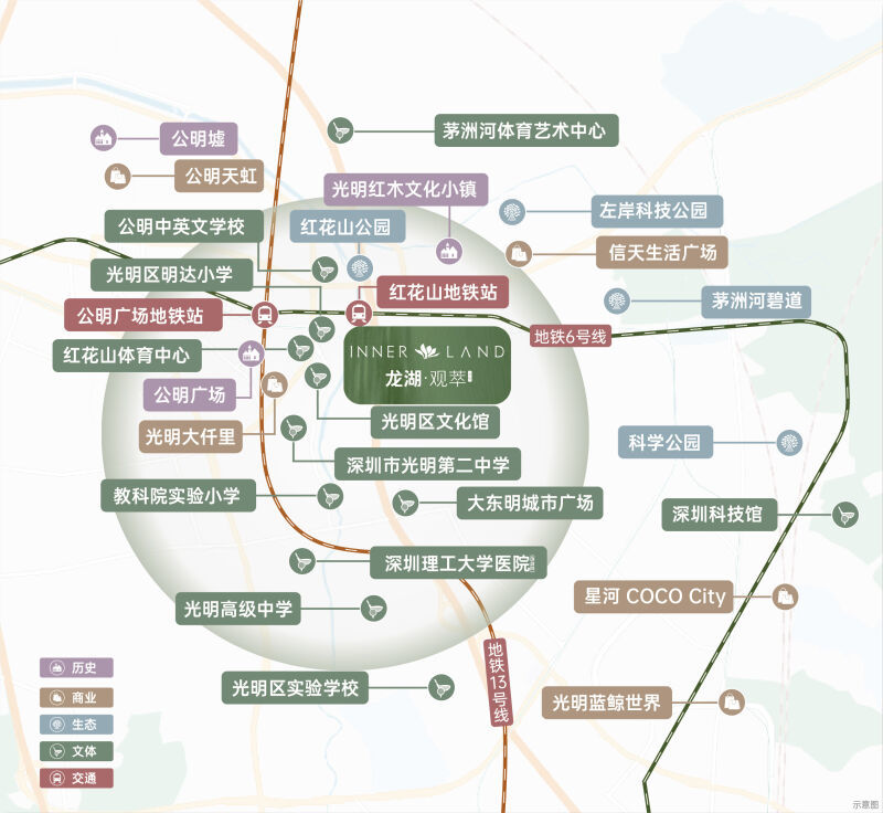 除了区域发展潜力,项目周边的成熟配套也是其核心价值所在。龙湖·观萃所在的约1平方公里范围内,集萃光明区的文化、商业、生态、文体和交通五大城市级核心资源。