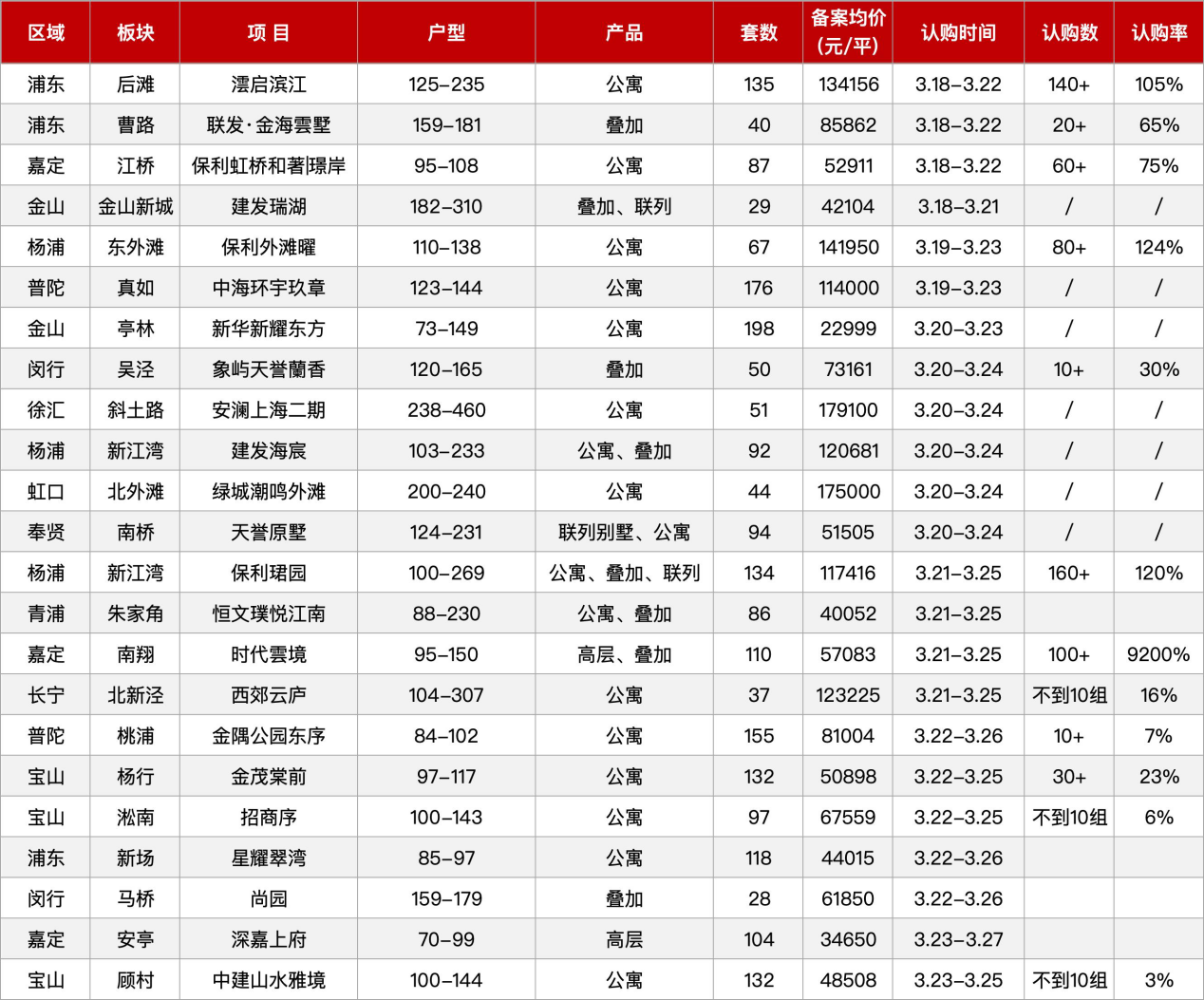 高热度楼盘主要集中在浦东、杨浦等核心区域。浦东后滩板块的澐启滨江推出135套公寓,备案均价134156元/平方米,认购率105%;杨浦东外滩板块的保利外滩曜认购率达124%;杨浦新江湾板块的保利珺园认购率达120%。这些项目凭借核心地段、稀缺产品及品牌优势,在认购阶段即触发积分或接近触发。