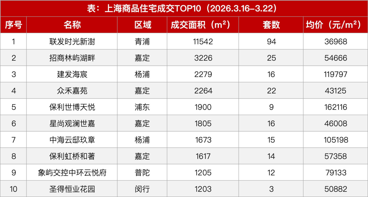 从成交TOP10榜单来看,新房市场呈现明显的结构性特征。高性价比项目成为成交主力,青浦区的联发时光新澍以94套、11542平方米的成交规模遥遥领先,均价仅36968元/平方米;嘉定区表现尤为突出,TOP10中占据4席,成为市区外溢需求的主要承接区域。