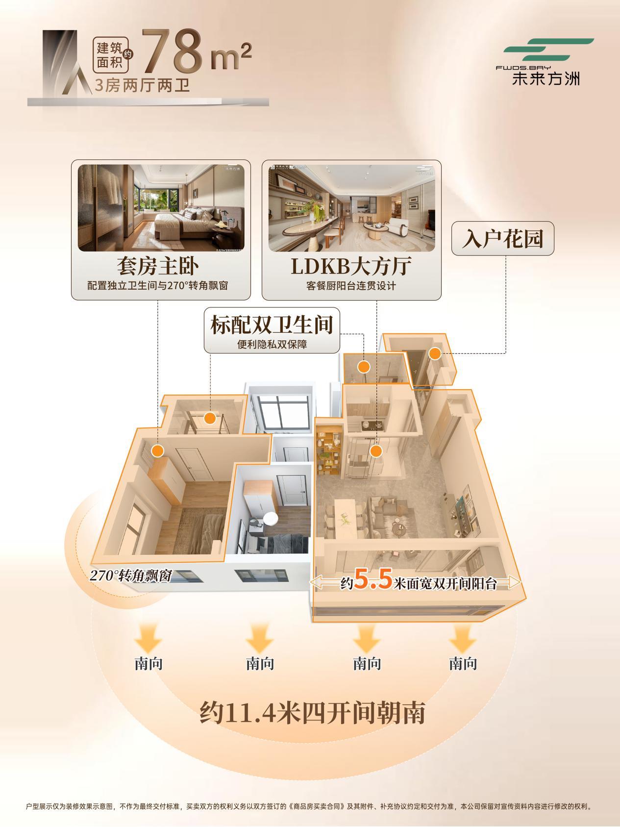 本次加推的二期【文荟】组团全新4号楼,在地段上占据更纯粹的静谧居住氛围,在产品力上更是实现了颠覆性迭代。作为广州新规后的迭代力作,二期产品实现了超高使用率的空间革命,真正做到“同等面积多一房,同等功能更舒适”。 建面约 78㎡爆款真三房两厅两卫,以11.4米奢阔南向面宽打造罕见四开间朝南格局,搭配5.5米双开间观景阳台,阳光清风满溢全屋。主卧配备270° 环幕飘窗,尽揽四季景致;LDKB一体化大方厅设计,客餐厨阳台无界衔接,既是家人欢聚的温馨主场,也是好友派对的潮流社交空间,精准契合当代广州人的理想生活范式。