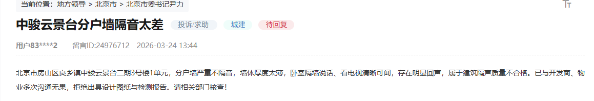房山区中骏云景台二期,分户墙隔声不达标,业主多次维权却无法获取项目质量检测报告,建筑质量底线失守。