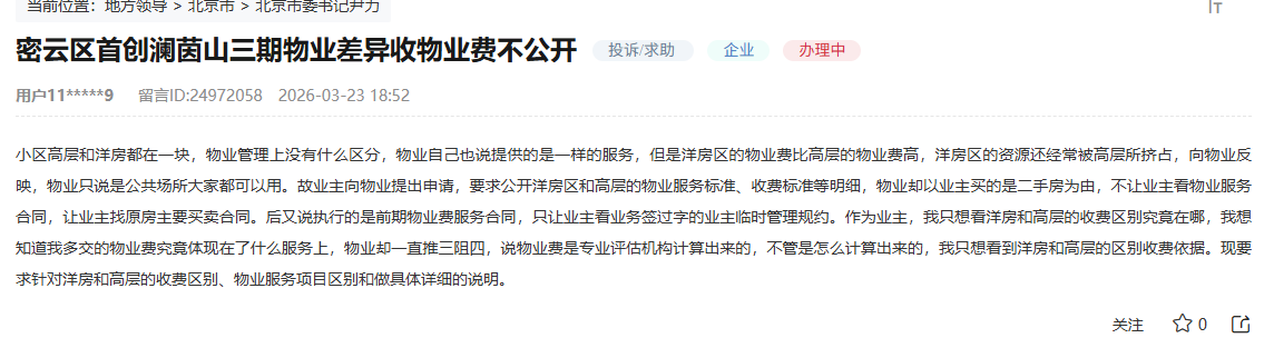 密云区首创澜茵山三期,业主遭遇物业 “差异收费却无差异服务”,洋房多交物业费却无法享受专属服务,知情权被物业以“二手房业主”为由拒绝保障;