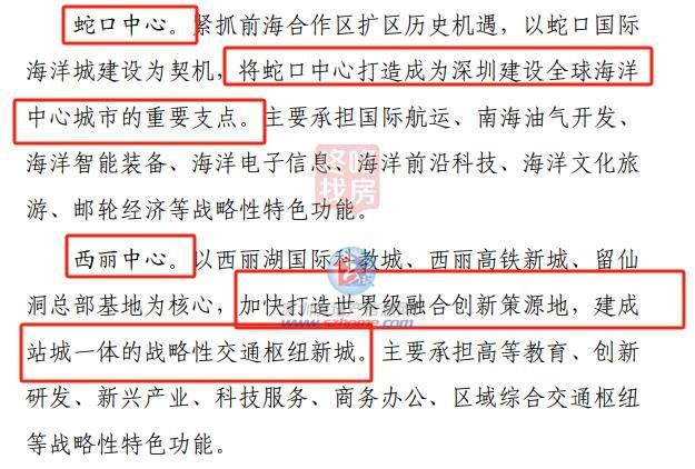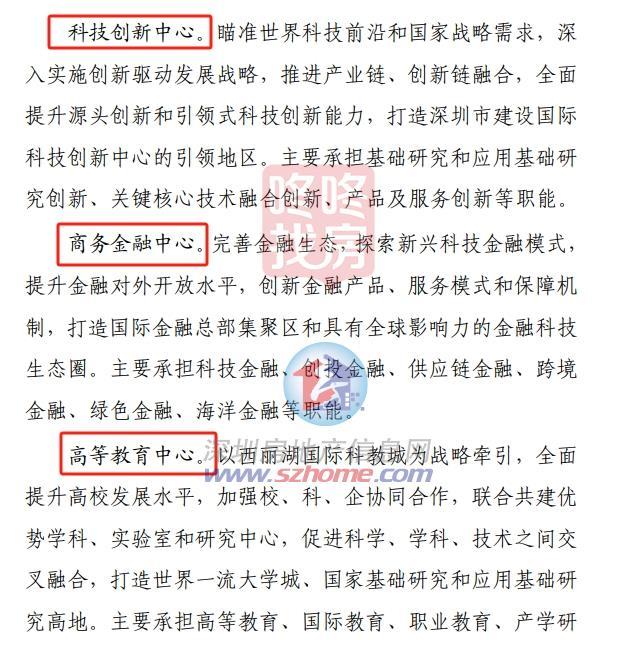 西丽中心:以西丽湖国际科教城、西丽高铁新城、留仙洞总部基地为核心,加快打造世界级融合创新策源地,建成站城一体的战略性交通枢纽新城。