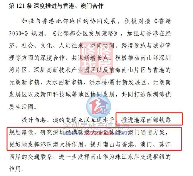 积极推进港深西部铁路(洪水桥至前海)的规划研究,在深圳侧设置深圳湾口岸和前海湾枢纽两个站点的基础上,研究远期线路向北延伸引入机场东枢纽的可行性。研究增设港深西部新通道的可行性,加强南山与香港西部地区的交通联系。