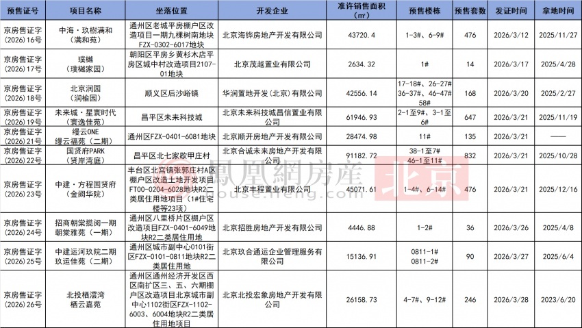 凤凰网房产注意到,3月北京共获批10张预售证,涉及10个住宅项目3120套房源,准许销售面积36.13万㎡,包括:中海·玖樹满和、璞樾、北京润园、未来城·星寰时代、缦云ONE二期、国贤府PARK、中建·方程国贤府、招商朝棠揽阅一期、中建运河玖院二期以及北投栖澐湾。