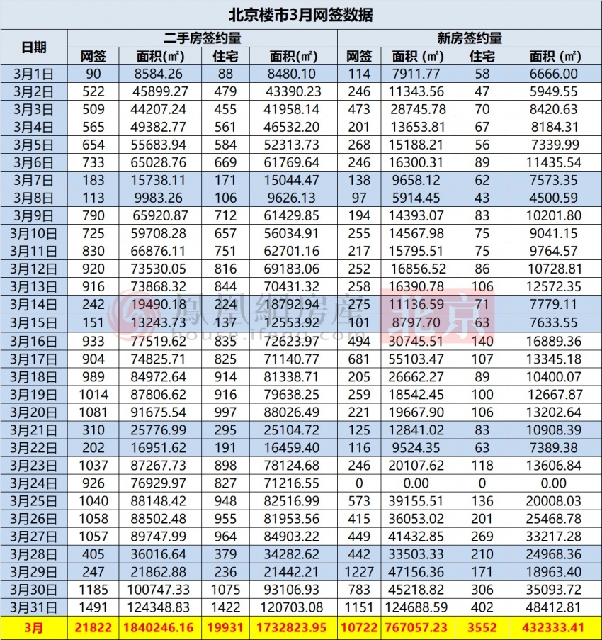 凤凰网房产北京讯 4月1日消息,根据北京市住建委发布网签数据显示,北京3月新房住宅网签数据环比大幅度上涨,同比均有所下降,是自2025年7月以来最高;二手房住宅网签数据环比同样大涨,同比微涨,创下2025年以来新高。