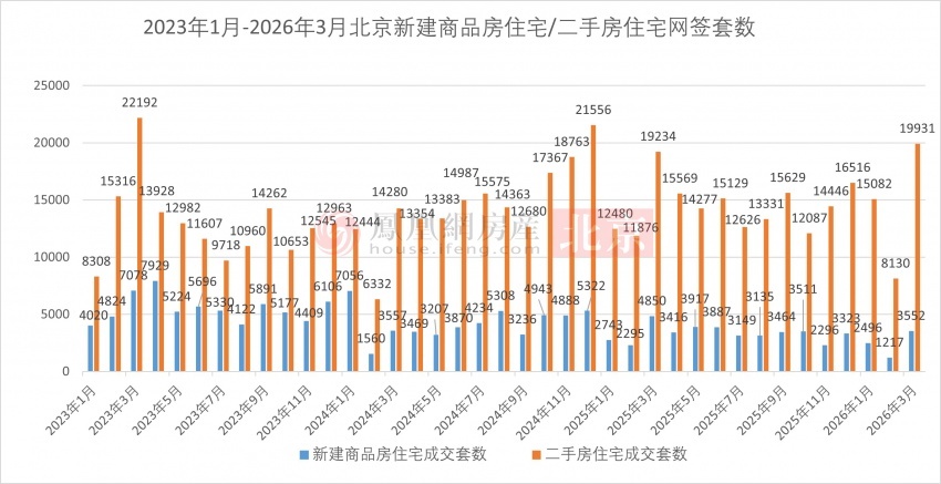 2023年1月-2026年3月北京新建商品房住宅/二手房住宅网签套数