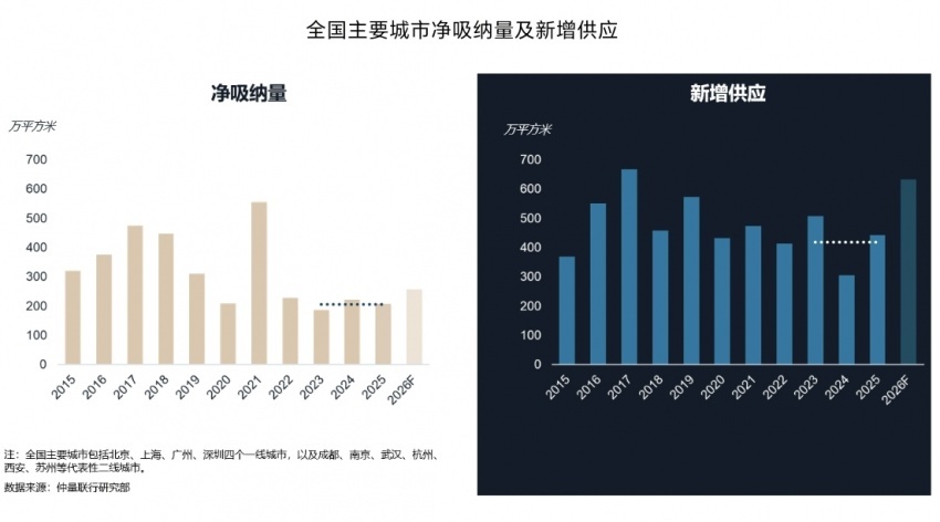 仲量联行数据显示,2025年全国主要代表性城市办公楼市场新增供应441万平方米,净吸纳量208万平方米,租金继续承压下行。预计2026年依然是办公楼的“供应大年”,但同比增幅将从去年的44%回落至27%;需求端仍以金融和专业服务为基石,受益于大量“新元力量”催生的需求增量,办公楼净吸纳量将温和复苏。