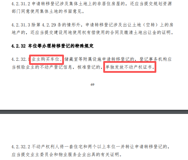比如“房产证和车位产证必须分开”,对应的是第4.2.32条——“业主购买车位、储藏室等附属设施申请转移登记的,登记事务机构应当核验业主的不动产登记信息,核准登记的,单独发放不动产权证书。”