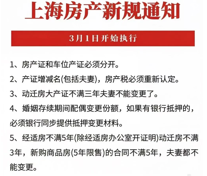 “3月1日开始执行:1、房产证和车位产证必须分开。……5、经适房不满5年(除经适房办公室开证明)动迁房不满3年,新购商品房(5年限售)的合同不满5年,夫妻都不能变更。”
