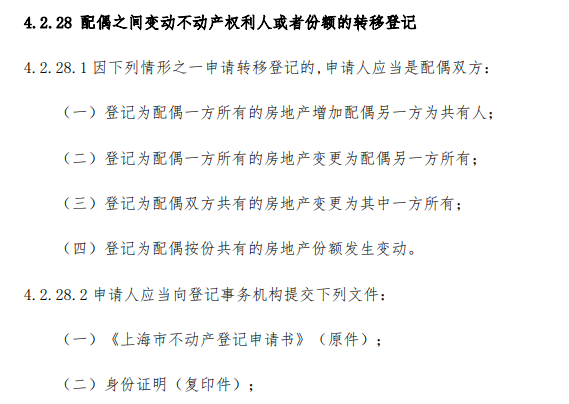 新规第4.2.28条明确:配偶之间变动不动产权利人或者份额,按“转移登记”办理。而在旧规下,夫妻之间产证加减名是按“变更登记”办的。