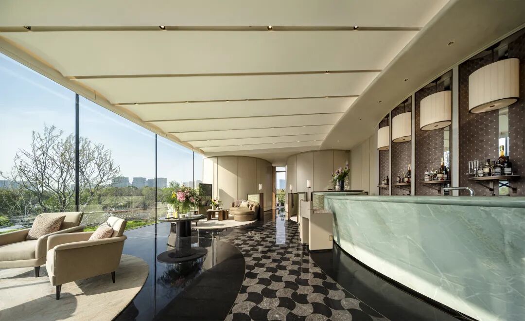 再往前,凤栖台约32米宽的曲面落地窗瞬间将视野拉满,最大270度的无界观景视野,将“河园巷院桥”和对面国际友谊公园如意湖组成的滨水低密风貌,在此窗前完整收藏。