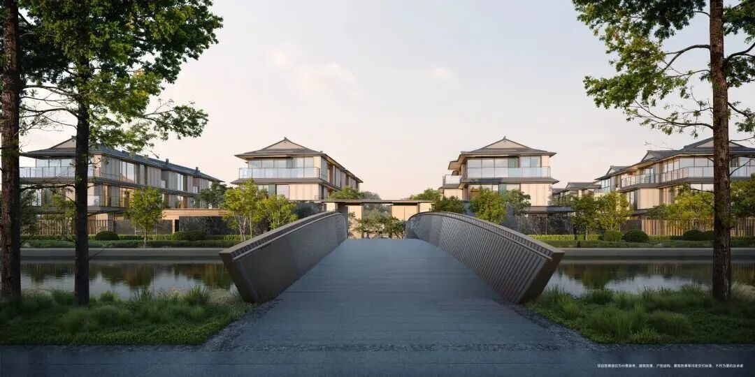 以内部桥连接两片低密社区,是项目独特的建筑规划。凤凰和鸣,翩然飞越或栖息于桥畔,整体勾勒出声音(鸣)、神鸟(凤)、建筑(桥)共同构成动态灵动的场景。