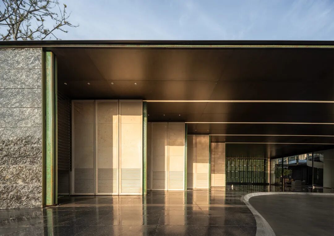 最引人注目的是,136片温润犹如绿玉的金沙绿琉璃陶板层叠排布,形成分隔内外的叠翠屏风,层层内退彰显府门威仪。