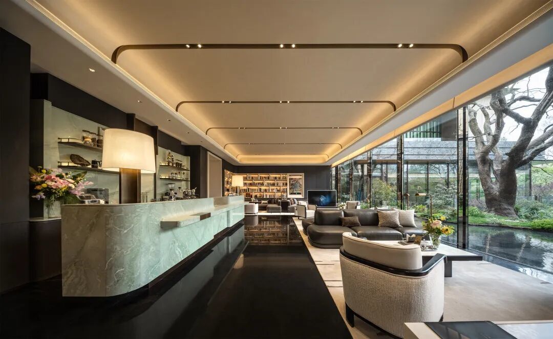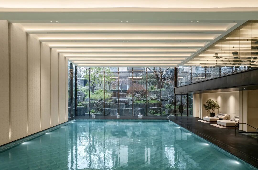 河西唯一挑高约7.8米层高恒温泳池与按摩泡池,独享双270度风景视野,下沉庭院风光映入泳池,天光云影共徘徊,水色庭阴相映成趣,对望全景舱式健身房。