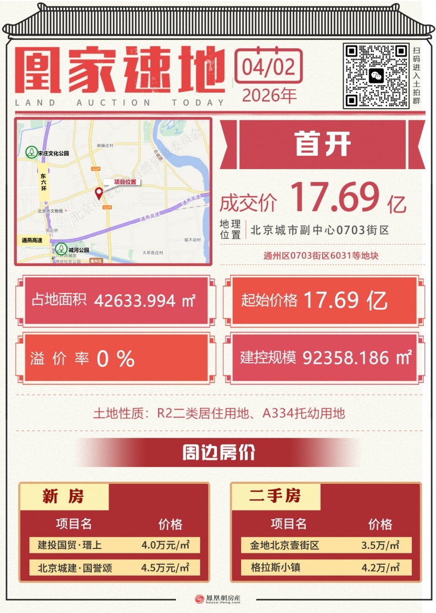 具体来看,该地块编号为京土储挂(通)[2026]008号,位于北京城市副中心0703街区,土地规模42633.994平方米(其中,住宅用地38833.994平方米,幼儿园用地3800平方米),规划建筑规模92358.1862平方米(住宅89318.1862平方米;幼儿园3040平方米),起始价17.69亿元,容积率2.3,建筑控高60米。