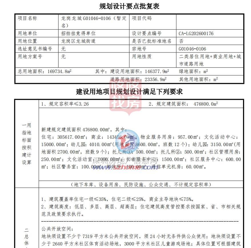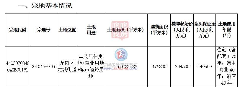大运地块(宗地号G01046-0106)为二类居住用地 商业用地 城市道路用地,土地面积169734平米,建面约47.68万平,挂牌起始价70.45亿。