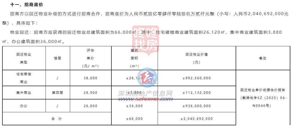 该项目招商底价以回迁物业补偿的方式进行招商合作,招商底价为20.4亿。
