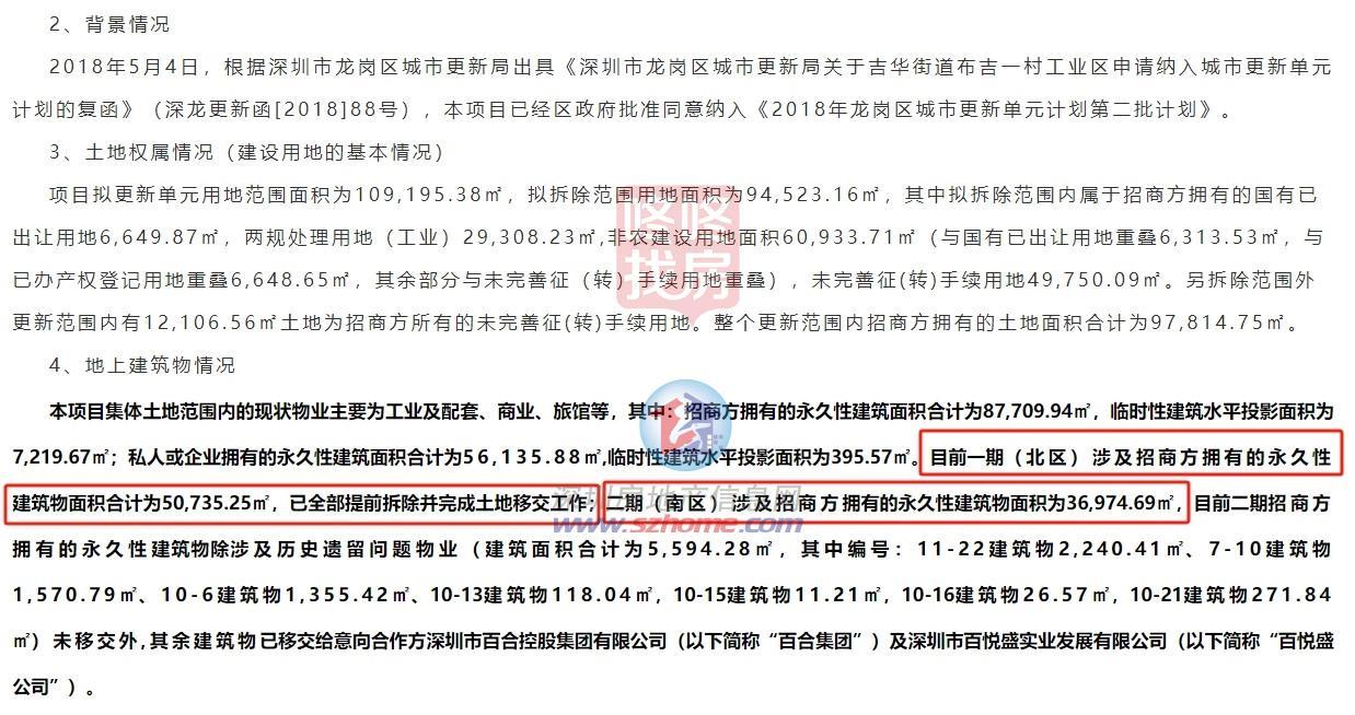 目前,一期(北区)建筑物已全部拆除并完成土地移交;二期(南区)除涉及历史遗留问题的少量物业(约5594㎡)外,其余建筑物也已移交给百合集团。