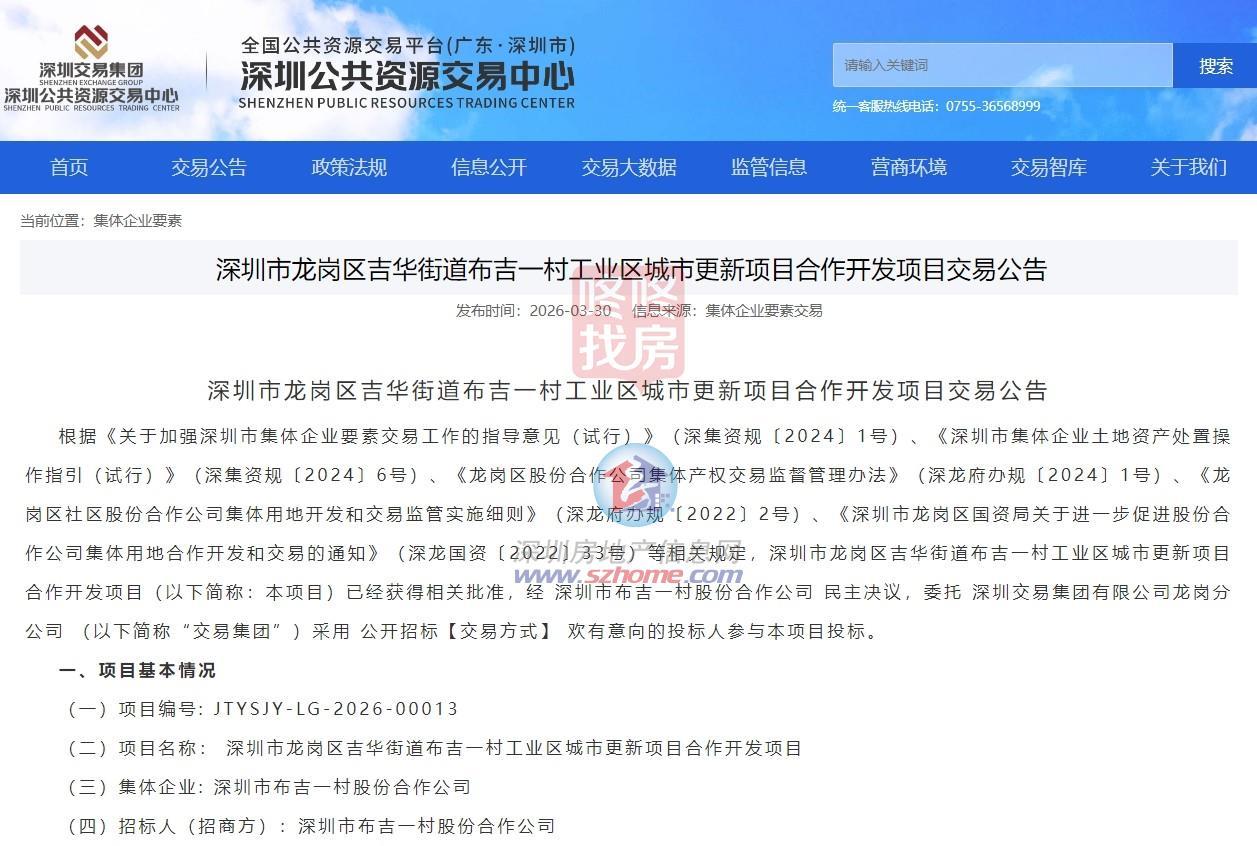 继宝龙街道三棵松地块土地整备利益统筹项目对外进行合作方公开交易招标后,3月30日,龙岗吉华街道布吉一村工业区城市更新也发布了合作开发交易公告。