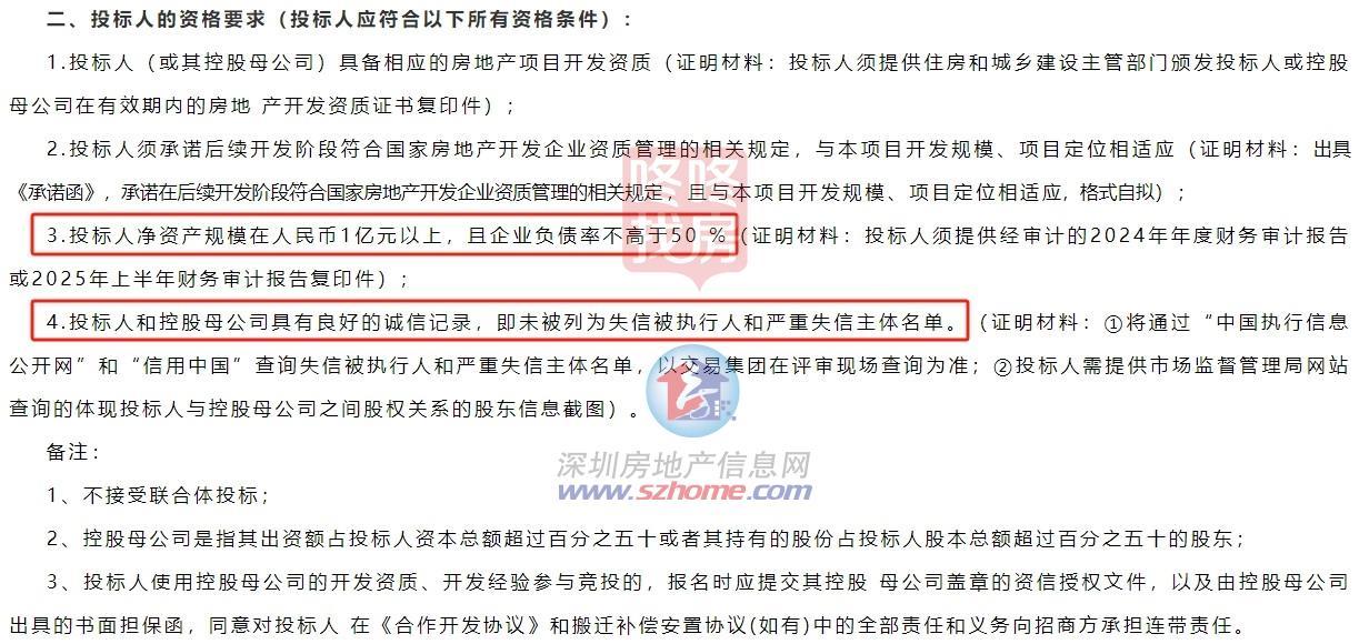 要求必须具备房地产一级开发资质 ,投标人净资产规模在1亿元以上,且企业负债率不高于50%。