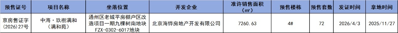 3月30日至4月5日,北京仅1盘获取预售证,该项目为中海·玖樹满和,此次获证房源为4#,涉及72套房源。