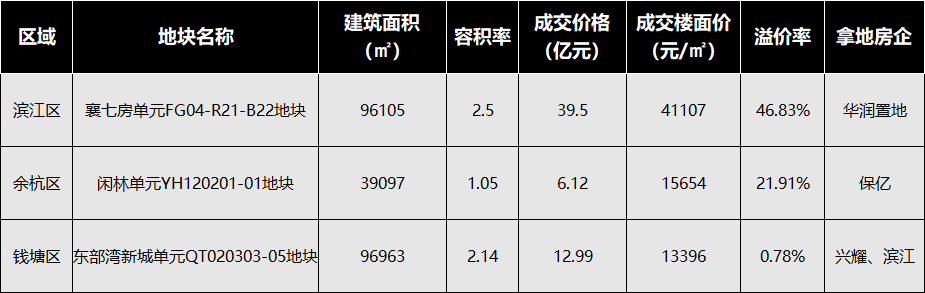 三宗宅地同日登场,分别位于滨江区长河、余杭区闲林和钱塘区东部湾新城,总起拍价44.8亿元。