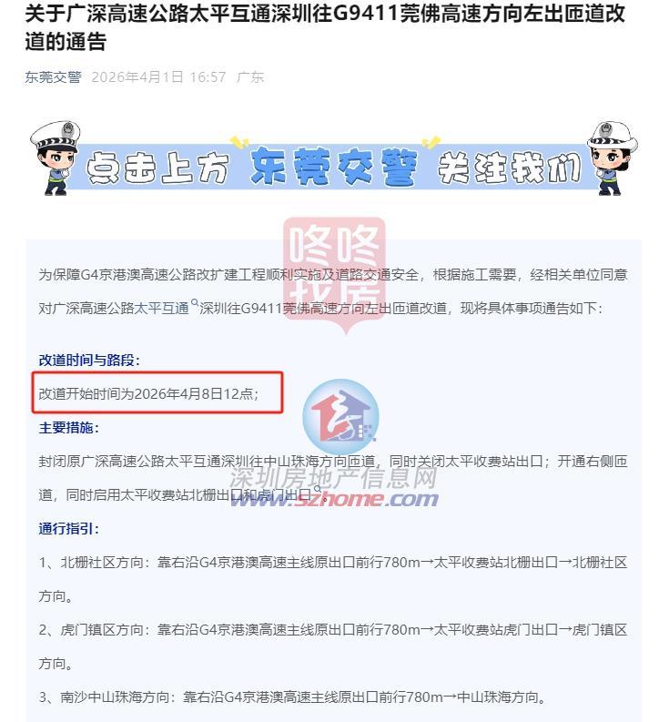 特别提醒各位司机朋友:根据施工安排,从今天(4月8日)中午12点开始,广深高速太平互通深圳往G9411莞佛高速方向的左出匝道将进行改道。