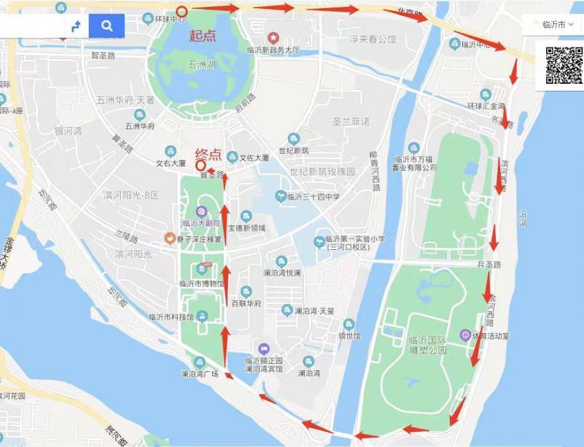 活动路线以五洲湖广场为起点,途经北京路、滨河西路、祊河路、府左路、算圣路,串联阳光沙滩、国际雕塑公园、广播电视塔等景观,终点设置在市文化中心南广场,全程约6.2公里。该路线不仅是风景优美的健身步道,也是展示临沂城市建设成果、展现沂蒙山水风貌、彰显城市人文底蕴的“城市客厅”风景线,参与者既能感受运动的快乐,也能领略临沂的城市魅力和发展活力。