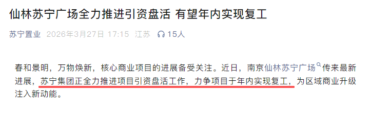 传来最新进展的还有仙林苏宁广场。苏宁置业官微发布:正全力推进项目引资盘活工作,力争项目于年内实现复工。