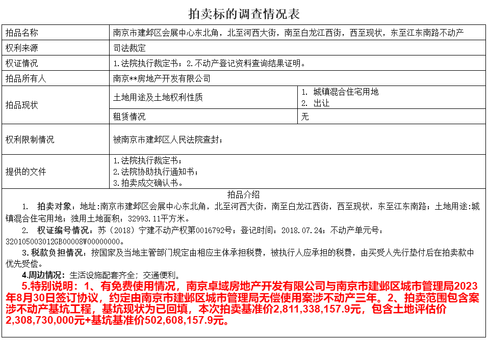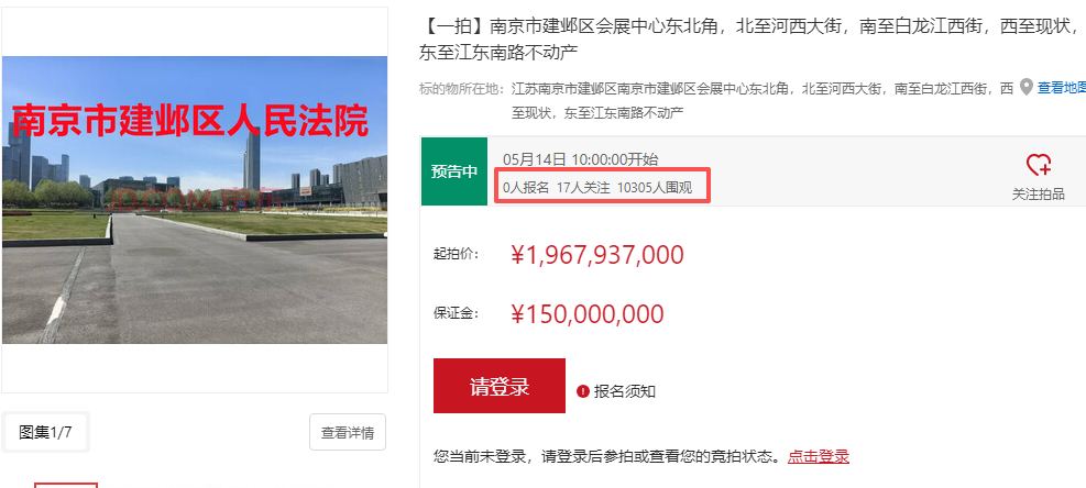 近日,南京市建邺区人民法院在京东资产交易平台发布公告,将于5月14日上午10点启动一处位于建邺区核心区域的不动产拍卖工作,项目北至河西大街、南至白龙江西街、西至现状用地、东至江东南路,起拍价达196793.7万元(约19.68亿元),评估价281133.82万元(约28.11亿元),竞拍需缴纳保证金1.5亿元,加价幅度1200万元,引发市场关注。